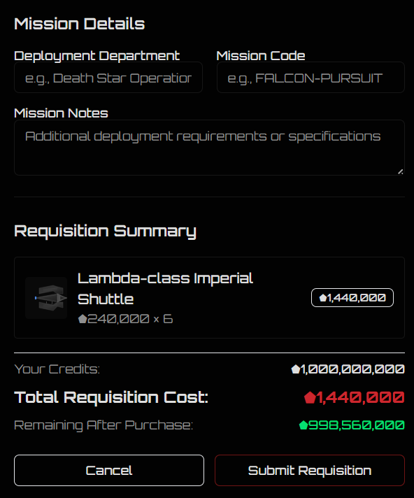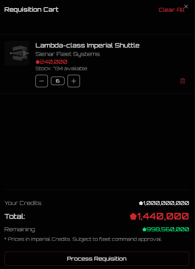 - Credit System: Track available Imperial credits and deduct them after purchases